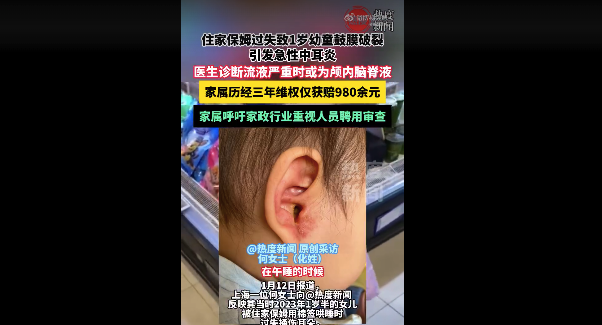 1月12日报道,上海一位何女士(化姓)向记者反映其当时2023年1岁半的女儿被住家保姆用棉签哄睡时过失捅伤耳朵,导致鼓膜破裂并引发急性中耳炎。如今孩子仍时常喊耳痛、自述听力不灵敏,但因司法鉴定需等六岁后才能进行,何女士历经三年维权,仅获赔980余元,保姆反而通过诉讼拿到了超出实际工作天数的工资。